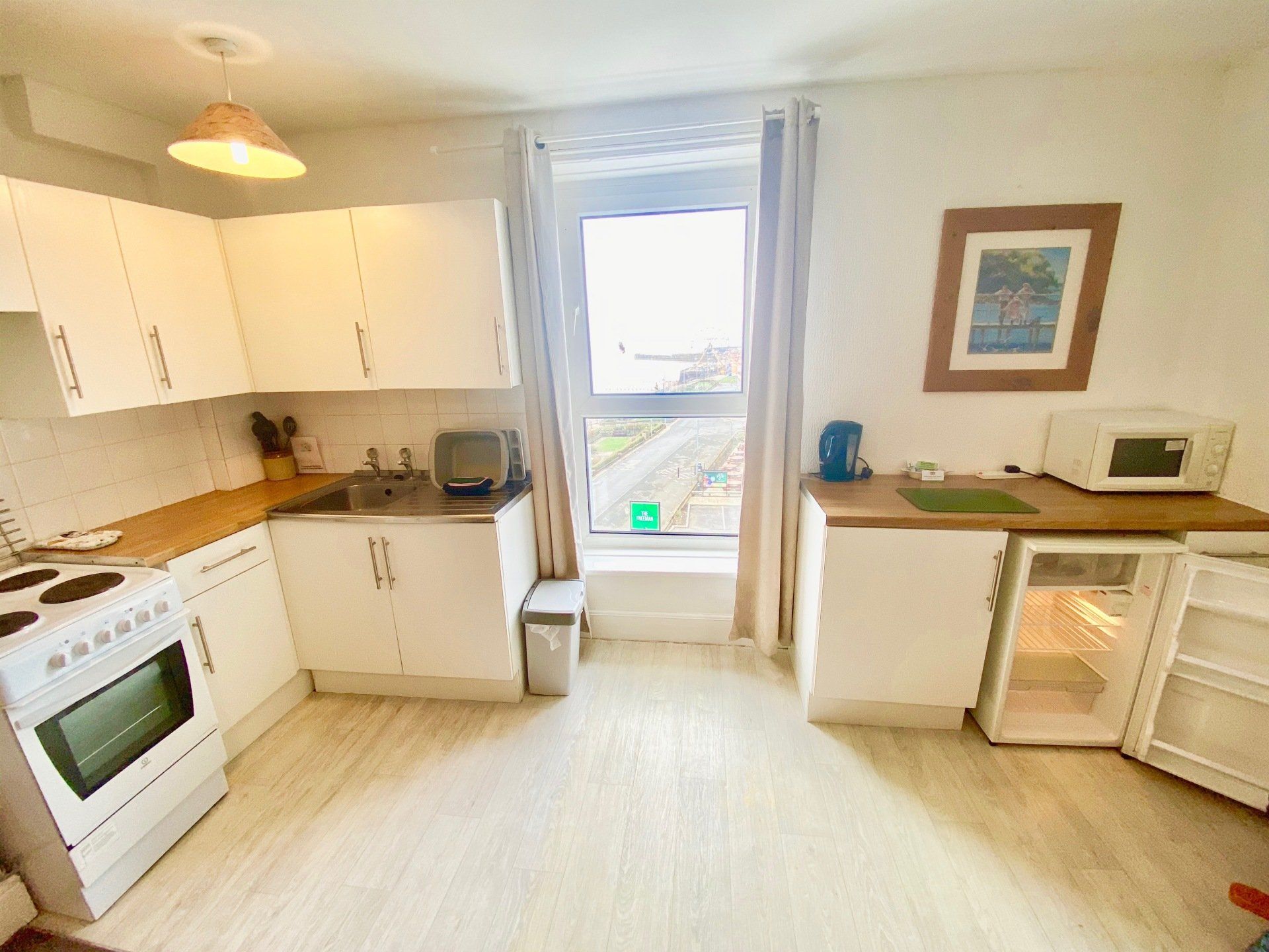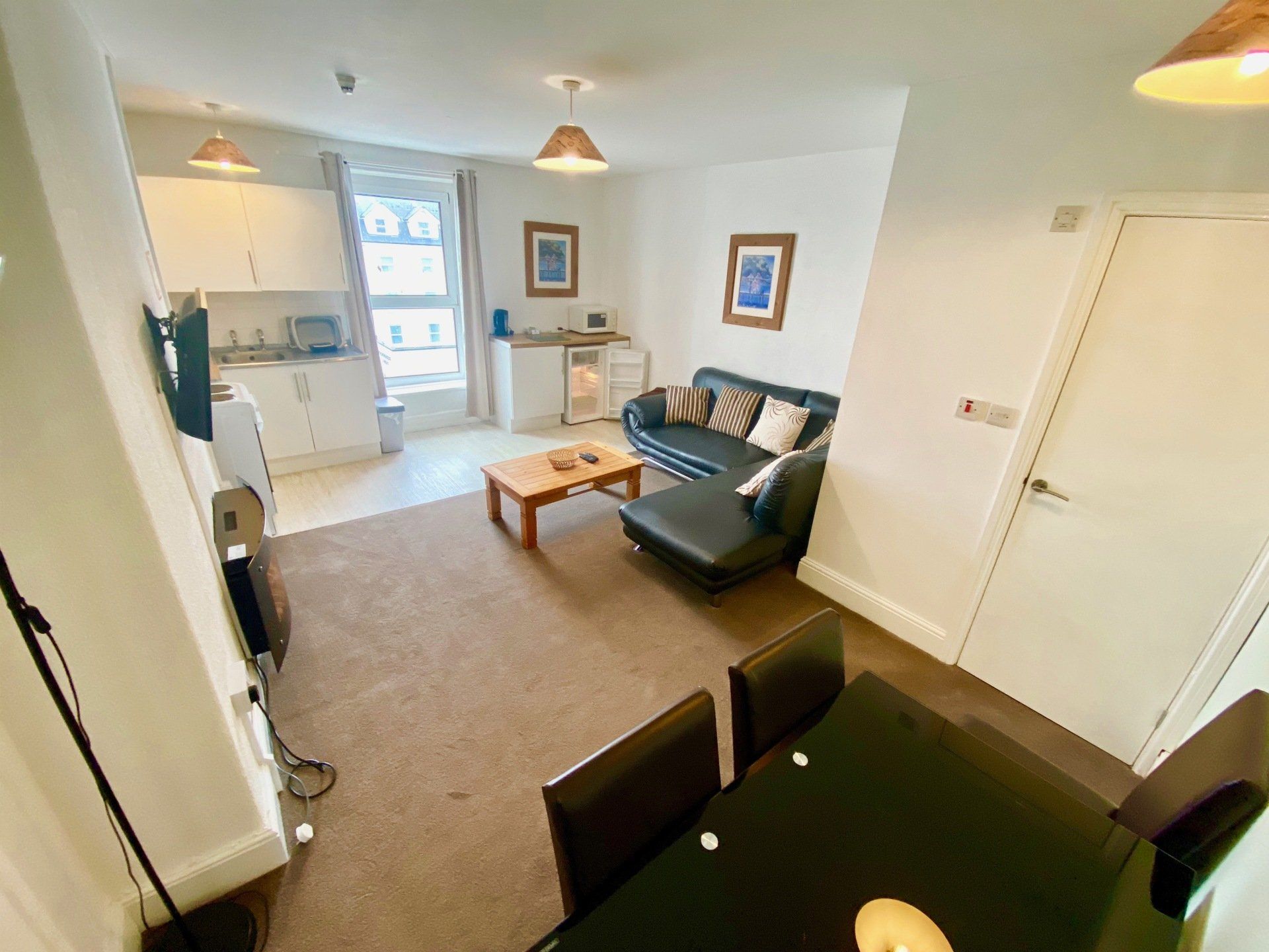 The Harbour View is a second floor apartment that sleeps up to 4 guests. The master bedroom has a king-size bed and the second bedroom has 2 single beds. The apartment has sea views from both the lounge and second bedroom.